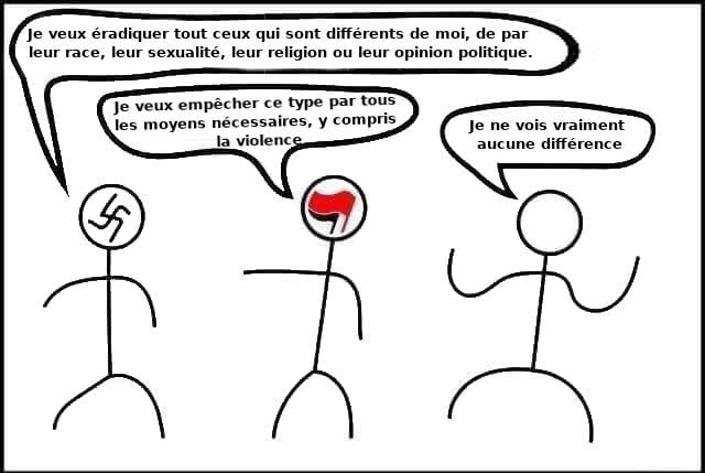 Non l’antifascisme n’est pas comme le fascisme, si demain les fascistes disparaissent, alors les antifascistes disparaissent aussi. A contrario, si demain les antifascistes disparaissaient, alors les fascistes continueront et augmenteront le niveau de violence.